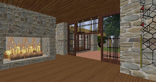 I caught up with Janelle this afternoon, and she explained her very good reason for her late start.  “My husband is in the military, and I had a last minute chance to go see him.  So unfortunately I put off the competition for a day… and when I got here I just knew I needed to get to work.”  Janelle is also working on another fascinating project which shows in her Usonian interpretation: “I am a part of Ichizoku Seikiji, a Japanese-styled House, and I have been helping rebuild their half sim.  The Ryuoshu, or head of the House, has given me the opportunity to help him out greatly.  He supplied the textures, and I would go to town with building blocks and put things together. Currently there is a game pavilion I put together, a meditation area, a waterfall, and a small bridge.   I am helping him with a walk through garden next, so I’m really excited.”