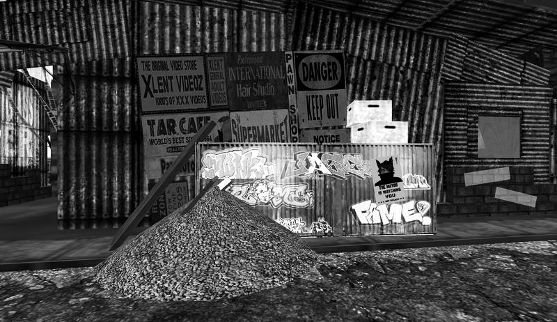 An avid photographer in RL, Trenton began playing with the SL camera not long after joining over three years ago. Like many others, he got his start rezzing his RL works, but soon wanted to explore what could be done in SL.  “The first exhibit I ever did I called ‘Urban Squall‘.  These were all black and white images shot in a handful of grungy urban environments.”  He smiles, reminiscing, “I decorated the gallery to match the exhibit, with a run down taxi, for example.”  He seems amused by his early experiment, but I can’t help but note that even in his early days, he was carefully considering the ways in which he could document the visual narrative of the spaces he explored.