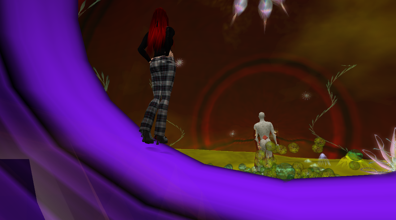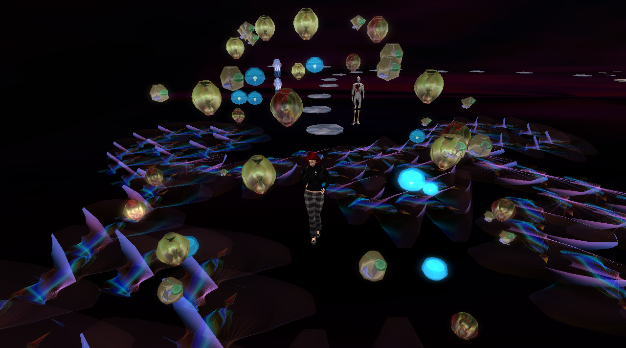 And as I can see his heart beating before my very eyes, I cannot but agree that he is indeed not dead. Glyph also took me on his own tour of his exhibit, but before we went there he wanted to show me one of his complete installations, ‘Strangers Also Dance’, now at the UWA sim (and you can check out the Designing Worlds episode on it here). As we walked through the strange landscape he created, I asked him to tell me a little about the theme of his work.