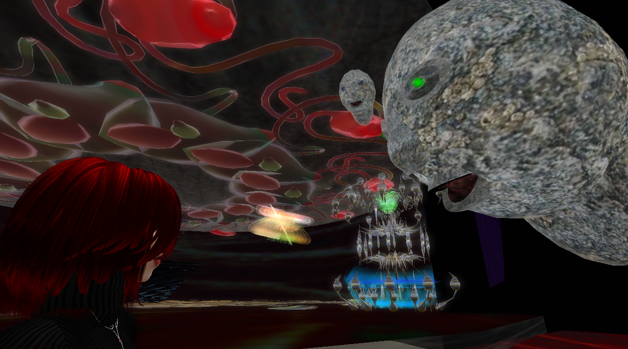 “Ahhh yes,” he said, smiling (I think), “the bones are not mine but the rest is inside and out.” (Humorous post-interview aside: at Saturday’s opening of Linden Labs CEO M Linden’s art exhibit ‘Doodles’, I heard M himself utter the immortal words: “Glyph, I’m camming around inside your stomach.”)