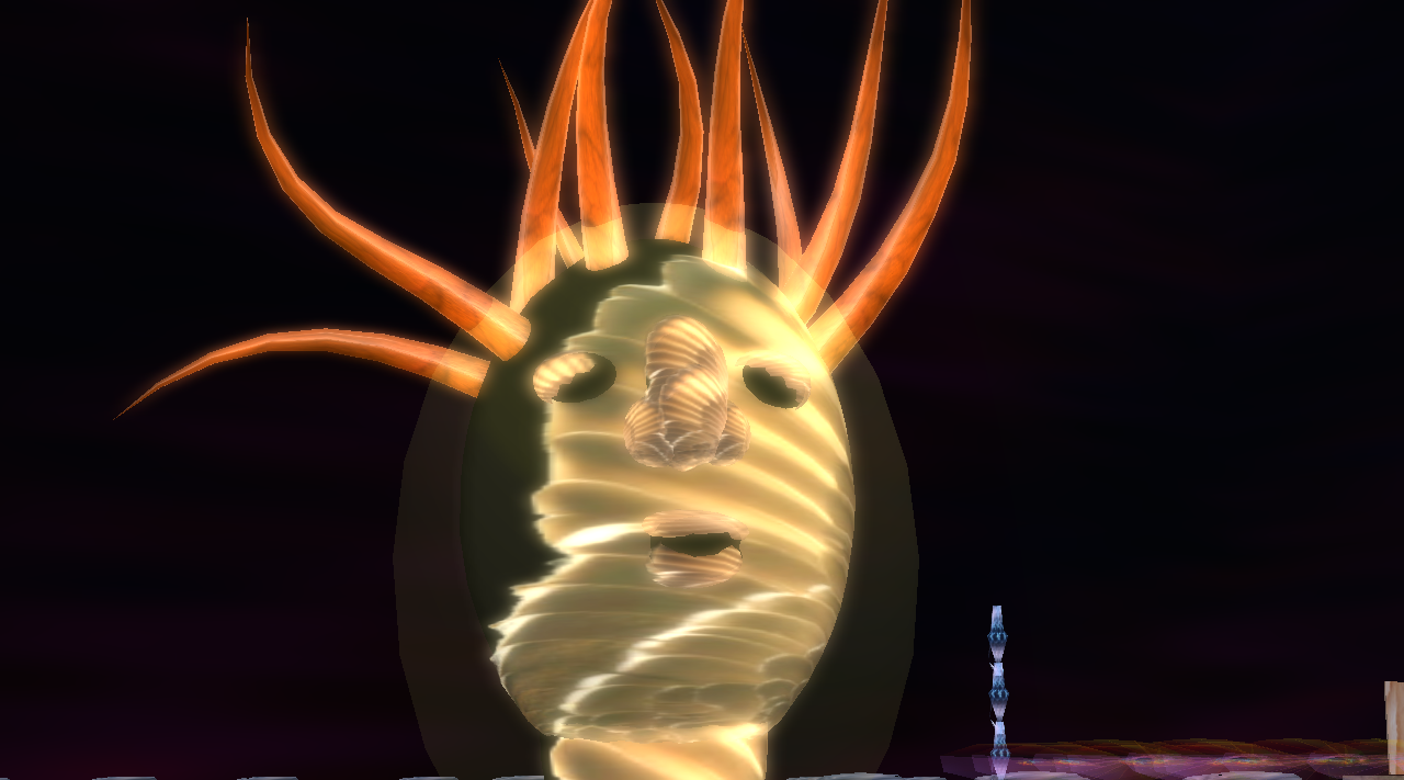 We walked to the edge of a rather surreal pond, at the centre of which floats a large pink and blue… crystal? A voice beckons: