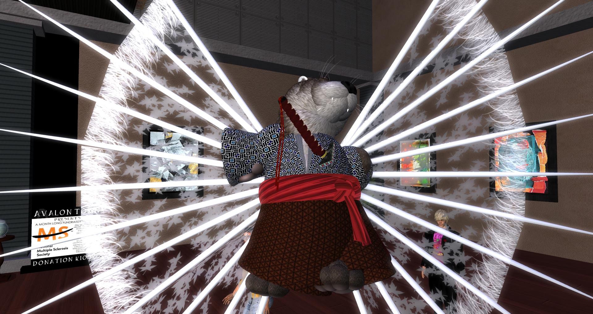 Scottius took me on a grand tour of his work – a massive undertaking considering that he exhibits all over the grid. Now, I’m a big believer in the old adage ‘When in Rome…’. I like to get to know other cultures from the inside, if I can. So what to do when I had the wonderful opportunity to interview this incredibly artistic, if tiny, otter? When in Rome…