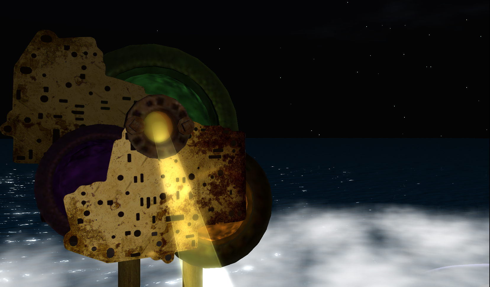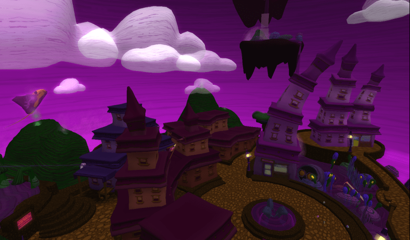 Psychedelic references aside, a visit to one of these installations is truly a liminal journey, taking the viewer betwixt worlds, to places that are neither here nor there. Scottius presses this liminality further at Lunamaruna via transport in a rather bumpy shuttlepod, which just barely lands at the top of a long path leading down into the village. The ultra-chromatic landscape is full of things to explore and discover: trees to sit under and cuddle with a friend, a relaxing fountain on which to nap, and, quite beautifully, three fuschia ‘mantra’rays flying through the sky, on whom one can not just ride, but meditate. However, as one explores, the sense that something has gone horribly awry in this seemingly bright and peaceful village begins to pervade. Rooms have been ransacked, and there are even some very suspect bones – I think human – found in various places.