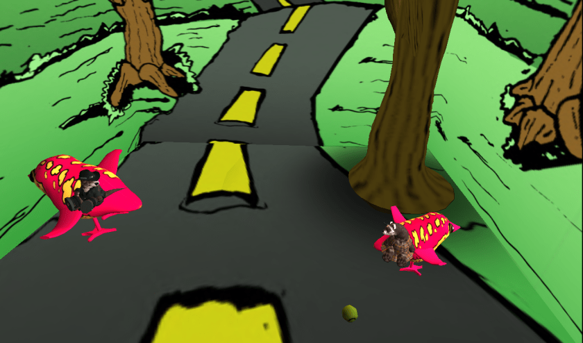 “And the possibility of being roadkill,” I smirked. In fact this is prophetic, as when one decides to try to ‘play in the street’ (the instructions on the pose ball), one suddenly finds themselves to be roadkill, and pecked at by the (manic) birds, who seem pleased: “Mmmmmmmm Roadkill!”