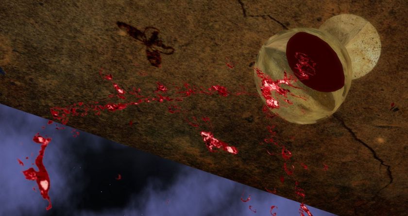 Below, we find the recorded memory of what clearly occurred above: upon the wall is the mural of Susas, five on the left and six on the right wearing various expressions of shock and horror; flanking two at centre who are engaged in an uncomfortable kiss. A chalice tumbles into our space, spilling more wine/blood, even as droplets fall like rose petals from the space above. A single lamp burns on the floor, next to scattered pages on which is written the tale of what has occurred (there are also voices narrating the tale, adding quite a haunting atmosphere).
