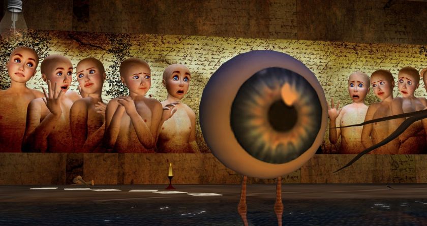 My next thought, upon looking at the mural of the 13 androgynous figures which is at the heart of this piece was: “These are NUDE? They are barely human.” I suppose they have fledgling breasts. But they are closer to shirtless boys… are males not allowed to be shirtless in a PG sim? I thought it was only women’s breasts we’re paranoid about. Honestly, there was nothing offensive that I saw in these images, they are just a little disturbing.