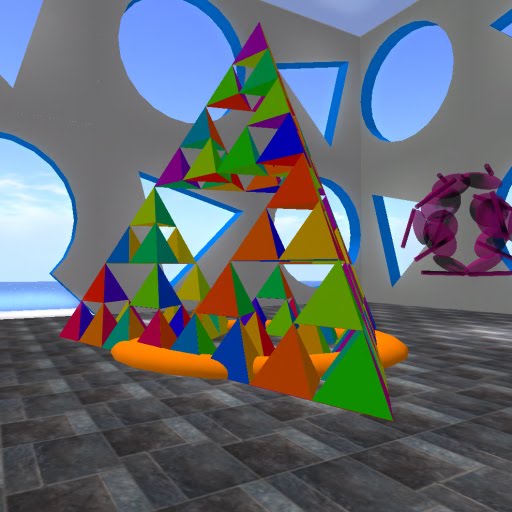 “I was amused to see several kaleidoscopic pieces in this round. The nature of SL prim building lends itself to recursive forms like that. It’s not hard to create interesting forms. But I admit my discovery of the effects of gravity on rotating flexible prims was a happy one. There is almost and organic quality to the piece as the parts spin and dance.”