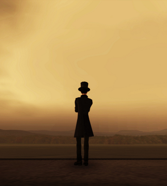 Perhaps ironically, it was to ‘The Quiet’ that AM took me to have our little chat, sitting in the warm glow of a wood-burning stove in a cozy cabin set in a snowy landscape. And even though it is a virtual landscape, I couldn’t help but don a sweater over my summery top, between the enveloping atmosphere of AM’s winterscape and his own frosty breath, an attribute of his avatar’s iconography. The artist is very tall, a fact only accentuated by his other attributes: the greatcoat, scarf, gloves and stovepipe hat – simply adorned with a strip of wheat and two feathers – that are his trademarks. His statuesque appearance may in fact be somewhat daunting, but I assure you he is one of the most genuine, down-to-earth individuals I’ve had the pleasure of talking to in SL. He’s also been around for a while, since 2006, so many readers may be familiar with both his artistic work and his background. But for those who aren’t, he told me a little bit about his early artistic development.