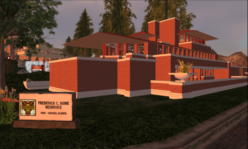 It’s all a go at the Frank Lloyd Wright Virtual Museum (FLWVM) just now! This weekend kicks off the opening of the Prairie School Houses exhibit, which features the very exciting return of the Robie House replica designed by Miltone Marquette. There will be a public reception on terrace at the Pope-Leighey House on Saturday the 11th from 4-5pm SLT. Board Chair Ethan Westland will emcee, and Curator Gina Broono will give a short talk on Prairie style. All are invited to tour and explore. This will be followed with a dance on the terrace with resident DJ Jaffee Gaffer from 5-7pm.