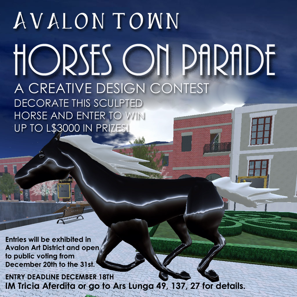 Avalon Art District invites all SL Artists and Content Creators to participate in a new creative contest! Based on the successful “Noobs on Parade” Contest in 2009, the new contest features a sculpted prim horse and an invitation to add your own textures, prims and creative twist to it.