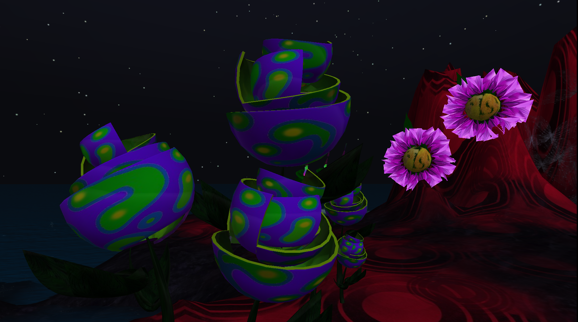 As I barely knew her, I hesitated to write this, and hesitated even more in calling it an Ekphrasis. However I did promise she was on the list, and so here it is. I have no earth-shattering revelations to offer, and cannot fairly write this column in the manner I wish as my conversations with the artists are integral to my discussions of their work. Thus, I have only one thing to say about her work: it is full of life. Go and visit Bloom on Erato Caerleon (she was at the centre of this art collective), and you will see what I mean. Magnificent and wondrous flowers burst from the virtual soil, and it is difficult today to not see them as emblems of her own spirit. Only one work here speaks of her struggle: Stage 4, a simple platform with phrases that vocalize her thoughts of anger at having stage four cancer. The one that hit me the hardest was “I have a lot more art to make.” A pose ball with the text “I am SO Angry!” allows one to have a virtual tantrum – something that some might find theraputic today.