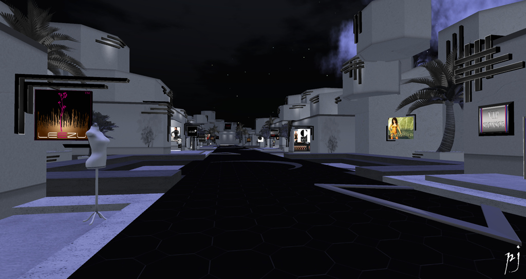 “There are three main elements to the sim,” said Haalen, “the shopping areas, the octagon risers, and the volcano in the back. The shopping, aside from it’s obvious functional requirement – represents the support of the community (aka gimme money). The volcano is the geographic analog to cancer – sudden, disfiguring, lift threatening, scary stuff – and the octagon risers, between, represent the support groups, research labs and treatment facilities that the stores and RFL in general support to buffer and protect and enclose and in time, conquer cancer, aka the volcano.”