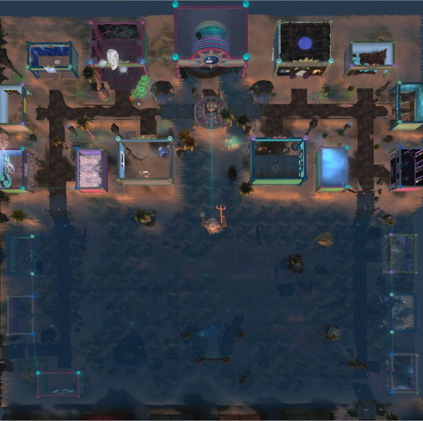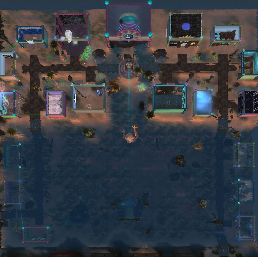 The path continues south turning back to the west and dropping once more down into the ocean. Take care to keep your arms away from the large clam shell on your right as you reach the step, you are better advised to keep to the left and visit the last two remaining stores for shortly we will rise to the surface and enter tomorrow’s destination Exotic Worlds.