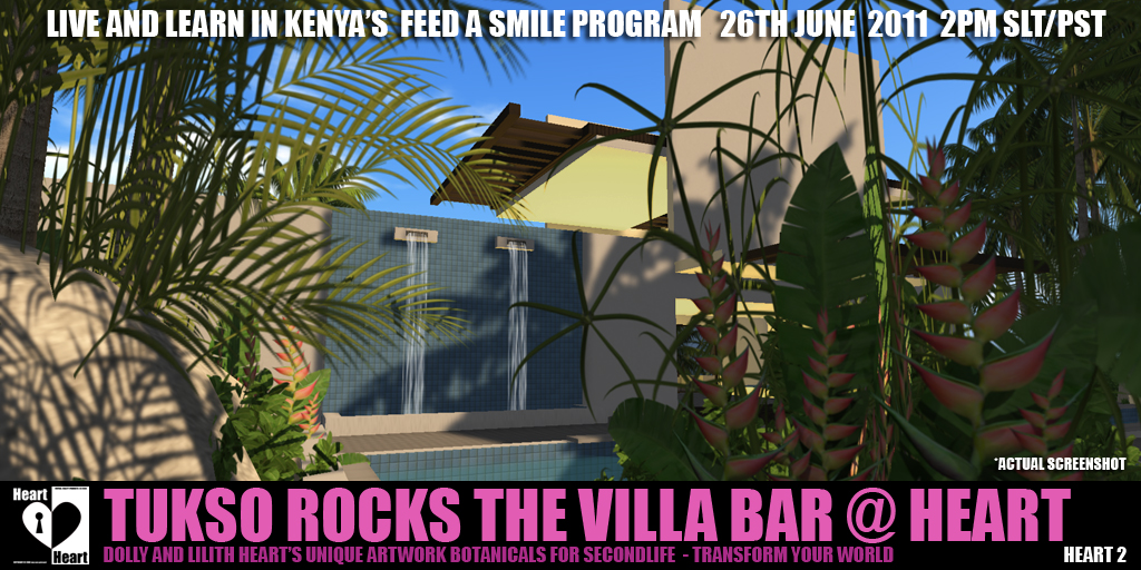 TUKSO ROCKS THE VILLA BAR @ HEART 2 THIS SUNDAY, 26TH JUNE 2011 – 2pm – 4pm SLT / PSTThe astounding and brilliant Tukso Okey will be playing a benefit concert in aid of Live and Learn in Kenya’s Feed A Smile Program ….. turning Linden Dollars L$ into Food and Smiles. Every 100L$ pays for a warm meal …. Remarkable ! Virtual currency into real food.