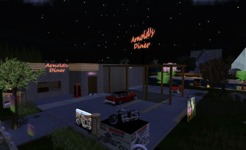 Standing opposite “Goodbye gray skies, hello blue”, the familiar sight of Arnold’s Diner recreated from the TV show Happy Days by the “Friends in memory of KevinBear Watanabe”