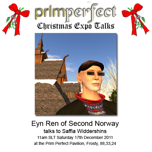 Today at 11am SLT in the Prim Perfect Pavilion on Frosty, Saffia Widdershins will be in conversation with Ey Ren of Second Norway.