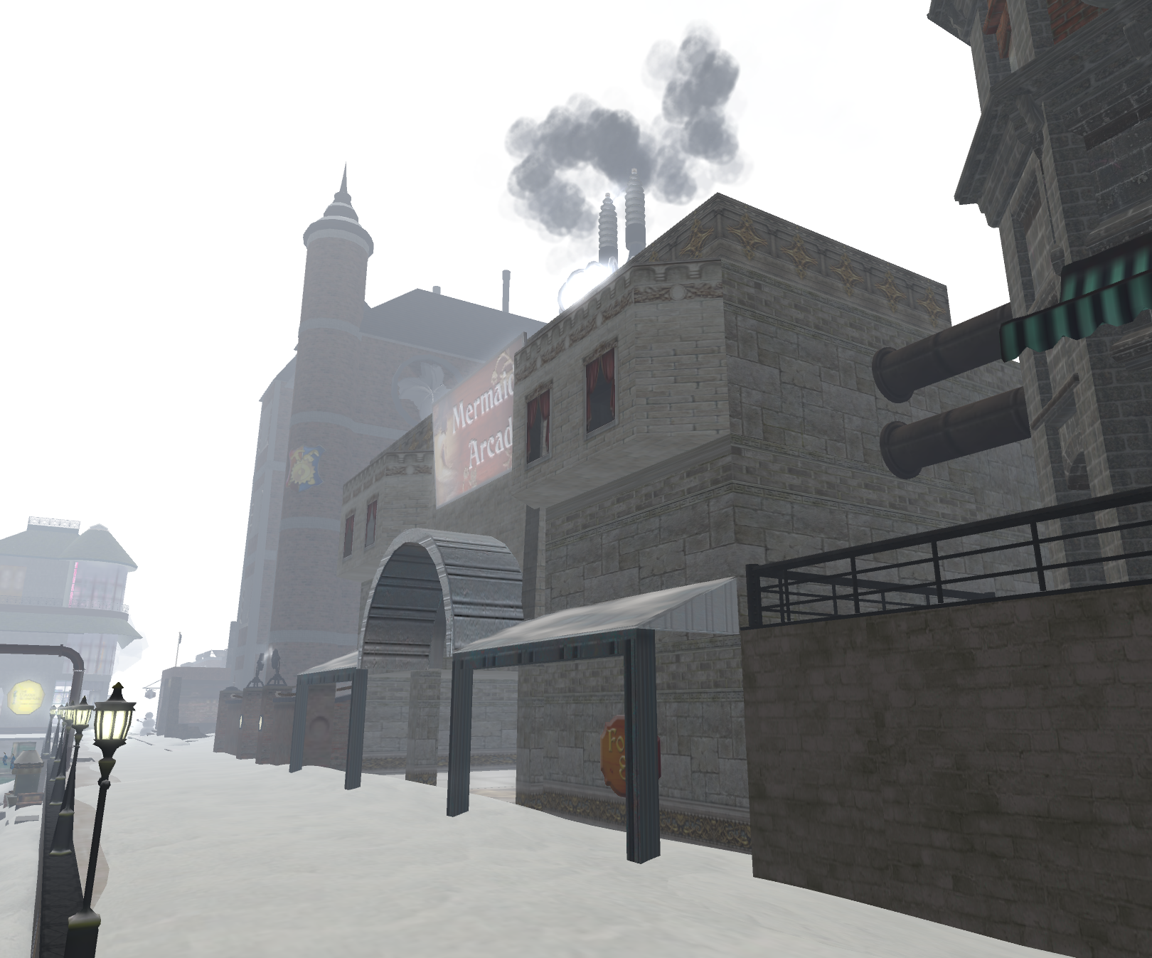 “The original Mermaid Arcade was in Babbage Square, then was rebuilt to the familiar white colonades when Port Babbage,” according to Mosseveno Tenk, the Mayor (and owner of the New Babbage region).  “It was last of the 3 anchor builds on the old Port Babbage … Many residents recall getting their start by renting out a shop in the 2 storey arcade. The interior had the feel of old walking malls of the late 19th century. Changes within Second Life that made outlet shops and commercial land less of a necessity than in the early years, combined with the slagging real world economy of the early 10’s, brought the gates of the Arcade to a close in December of 2011.”