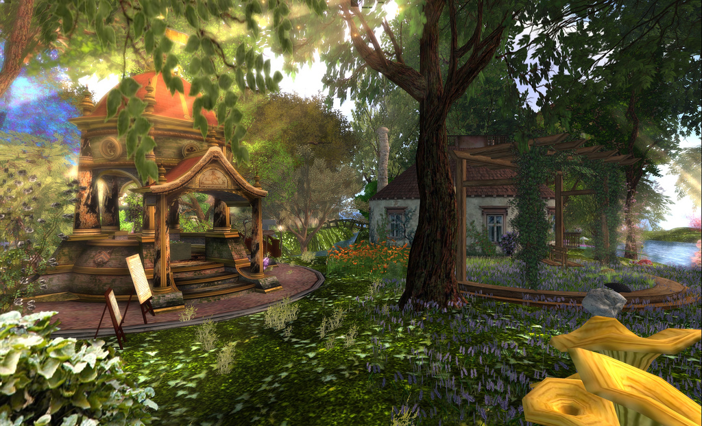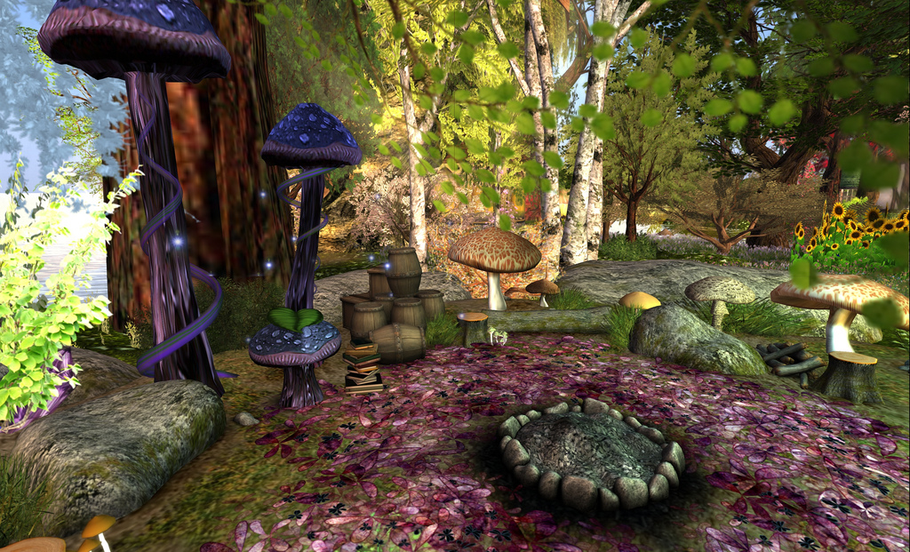 Visitors are welcomed in a charming faerie circle and are invited to begin exploration on foot from that point or to utilize the portal to be taken to any of several featured areas of the sim.