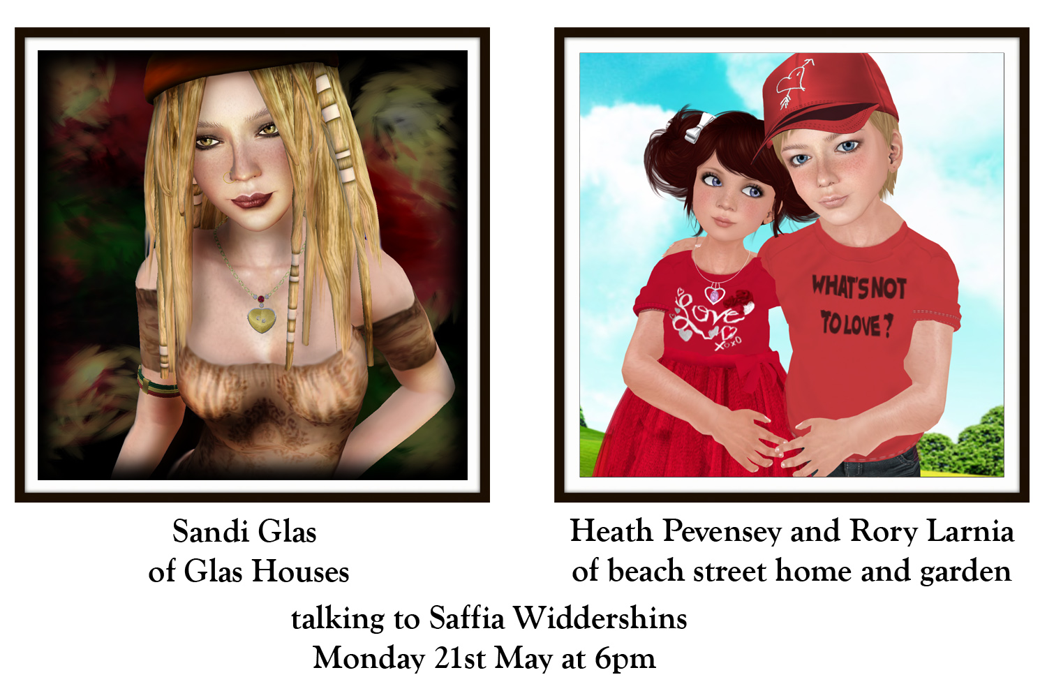 We have a busy day here at the Prim Perfect Pavilion on Home Expo 13 with two Meet the Designer talks with a variety of people participating! First, at 2pm, we have Jessii2009 Warrhol and Guarocuya Giano of Nexgen Aviation and the Flying Tigers, who will be talking to Elrik Merlin, and at 6pm we have Sandi Glas of Glas Houses and Heath Pevensey and Rory Larnia of [][]beach street[][] homes and gardens.
