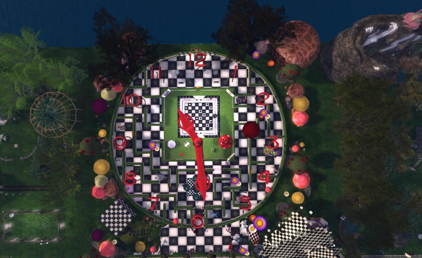 The campsite is a garden maze heavily influenced by the Alice stories by Lewis Carroll and with a fully working chess set at its centre. yet view ed from above the site becomes a clock face.
