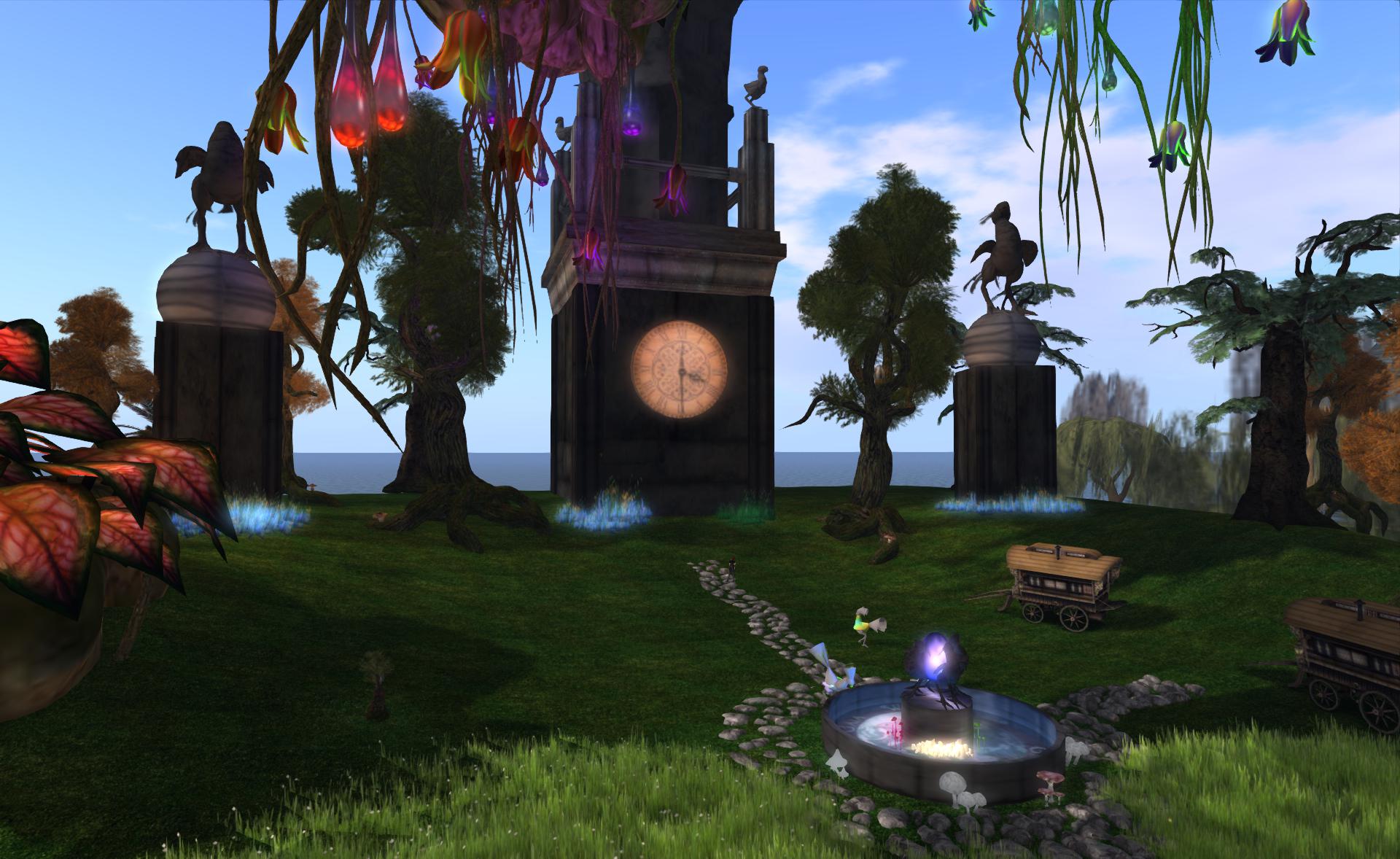 Just across the way our third clock tower this one produced by the Gaia 4 life team and set amongst the familiar but always lovely extraterrestrial plant life of Elicio Ember. You can rest a while by taking a quick lie down in one of the Gypsy Vardos.