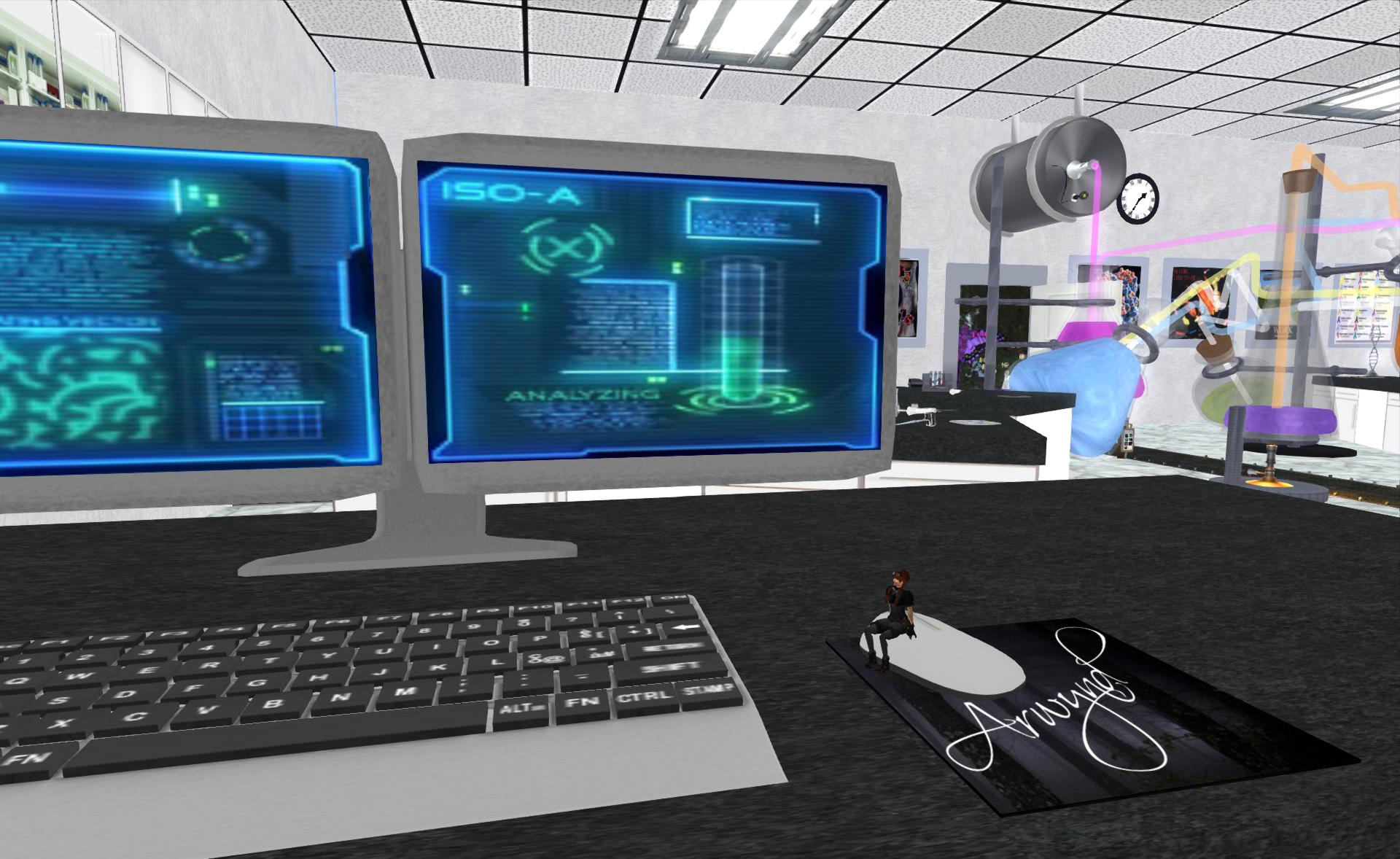 The parking lot leads us into a giant’s laboratory built by Rathmeous Dagger and Alecto Vella who those who follow this blog may recall built the rather lovely Dreamseeker Epoque sim for Tres Beau at Fashion For Life. The photographs do no justice to the scale of this build without a little context so here is your trusty reporter sitting on a computer mouse.