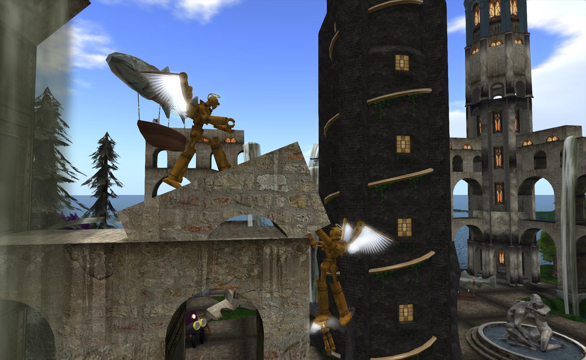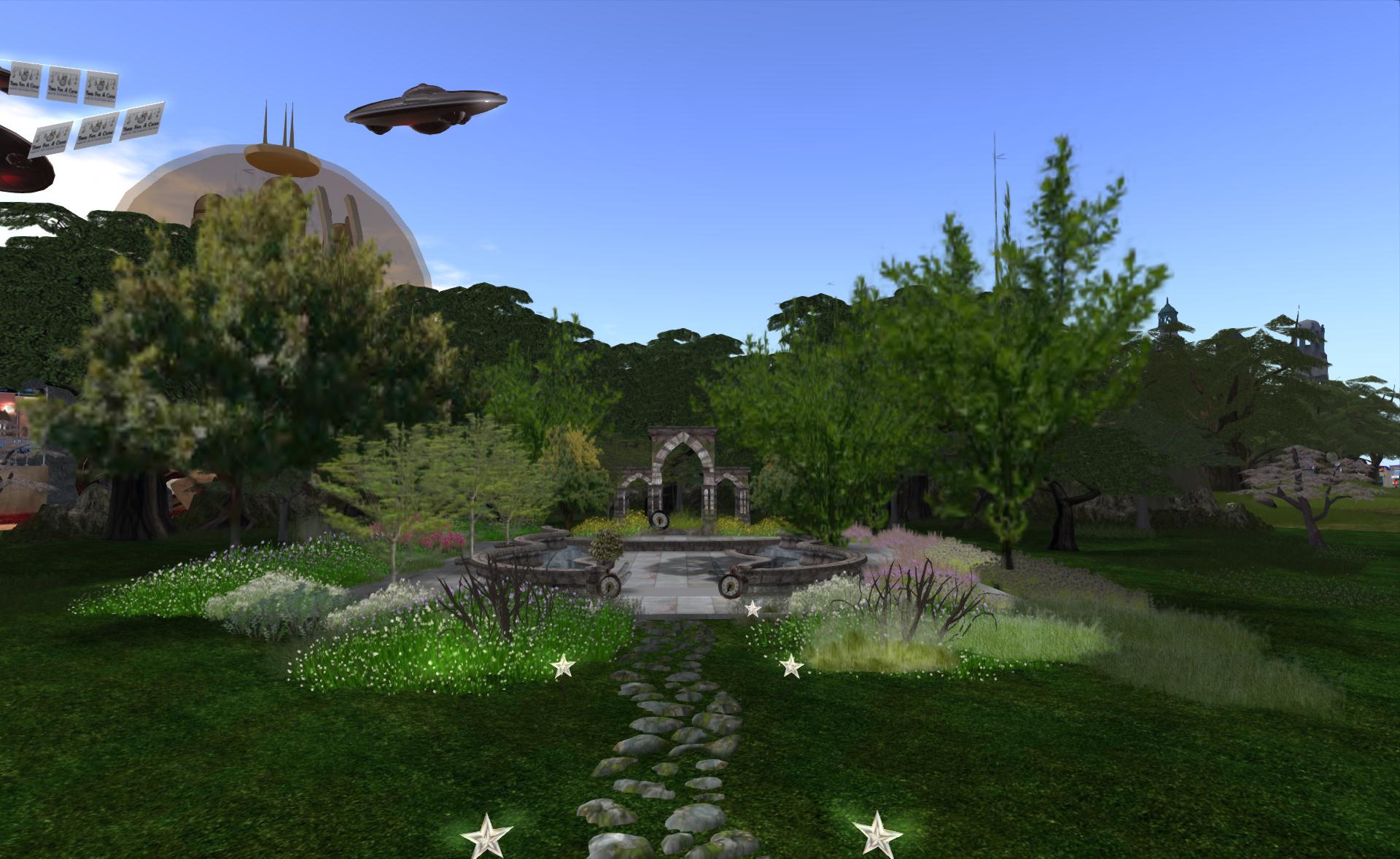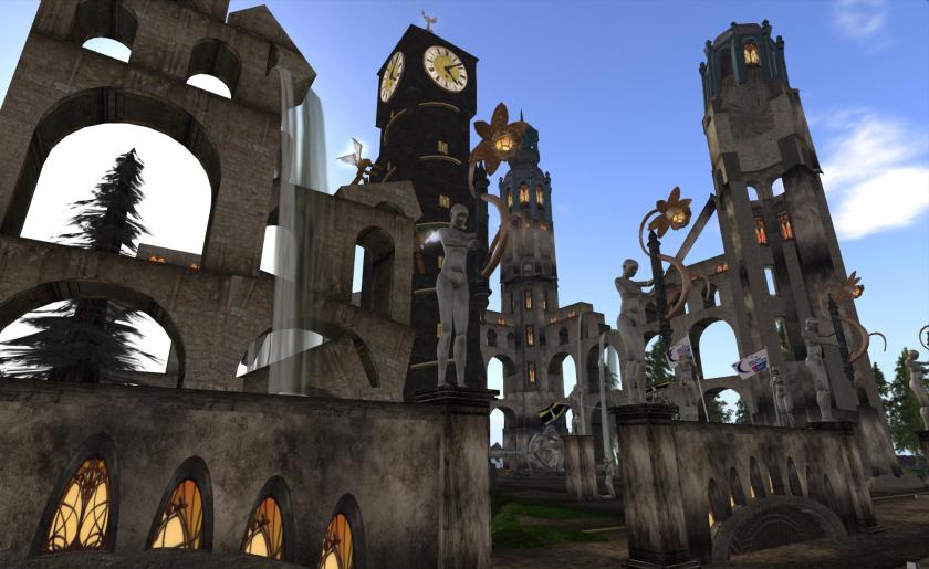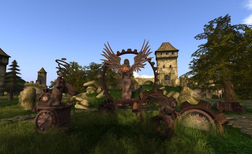We are standing now in RFL Healing, still heading South and to our left is Serlait Nitsche’s designer build. A truly eye-catching creation whose heart lies somewhere between Steampunk and Skyrim. A great fusion of two genres as the hooded monks cast in rusted iron as if struck down by some magical curse are caught in the froes of dismantling clockwork mechanisms. There is something quixotic about the scene as you wonder quite what was going on.