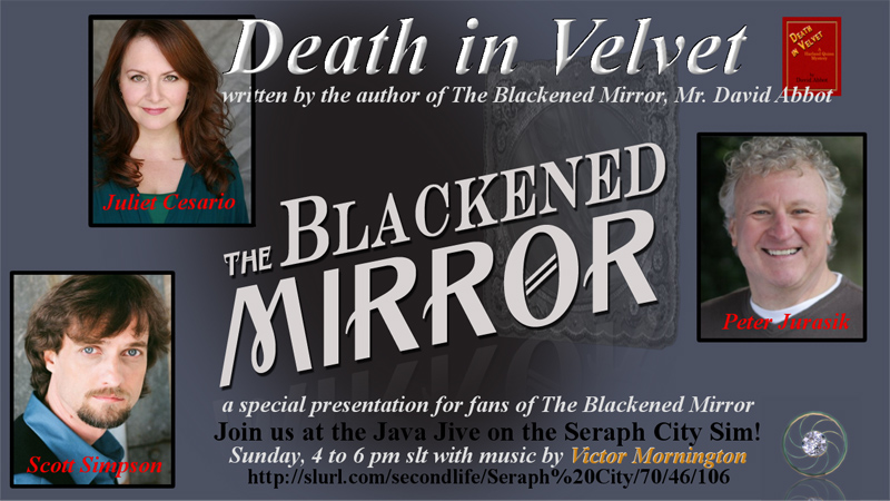 The radio play will be broadcast as part of a special celebration for Second Life fans of The Blackened Mirror. The event will be a party at the Java Jive – a popular club in Seraph City in Second Life. As well as music from popular DJ Victor Mornington, three instalments of the radio play will be broadcast during the course of the party, between 4pm – 6pm Pacific Standard Time.