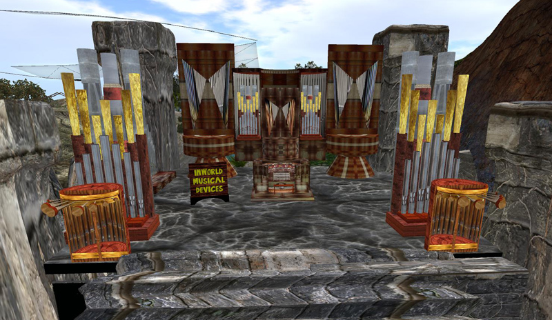 Usually one goes to LEA (Linden Endowment for the Arts) sims to see the creations of Second Life’s best known (and sometimes newly discovered) artists. Many will offer a high level of interactivity in their creations – some will offer sound as part of this.But Of Sound Mind goes further. It’s an installation – more properly a series of installations – that references primarily sounds. It’s the creation of Lorin Tone and Friends (said friends including Glyph Graves, Madcow Cosmos, Inventor Alchemi, Mia Anais, Meriadne Merlin, P4ndor4 Quintessa, Marcus Parrott, Judi Newall, Chantal Harvey and Cube Republic). There’s a wealth of different environments and sounds to explore – instruments to interact with … and, actually, some stunning things to see, ranging from a spooky cave to a giant musical castle in the air, from a Hindu temple with a wealth of musical instruments to an amazing total windsculpture by Glyph Graves.