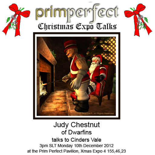 Today the talk in the gorgeous Prim Perfect Pavilion is at 3pm, when Judy Chestnut will be talking with Cinders Vale about the new Dwarfins.
