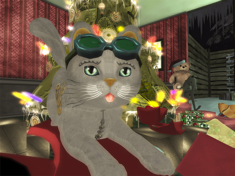 Tara Yeats sent me today’s jigsaw photo of her own cabin (No. 13 if you’d like to see it fully!) which has a gorgeous steampunk theme – complete with the special steampunk cats that were KittyCats’ Relay for Life special cats this year.