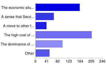 | 1) What do you think are the major factors causing the decline of private landholding in Second Life? People could select more than one checkbox on this question, so percentages add up to more than 100%. |