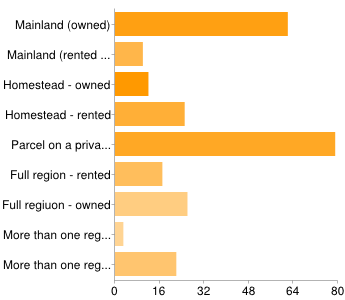 When it comes to types of land held, the highest proportion was parcels on private estates (42%), followed by owned parcels on mainland (33% – which would, of course, include the free land or Linden home that comes with premium membership). Larger land parcels seemed less popular – only 19% owned or rented a homestead; 23% owned or rented a full region (which would include commercial regions that house stores) and 14% owned or rented more than one full region. This question allowed people to specify all their types of land, so the percentages can to more than 100% – I myself have a Linden Home and rent several parcels on private estates, for example.