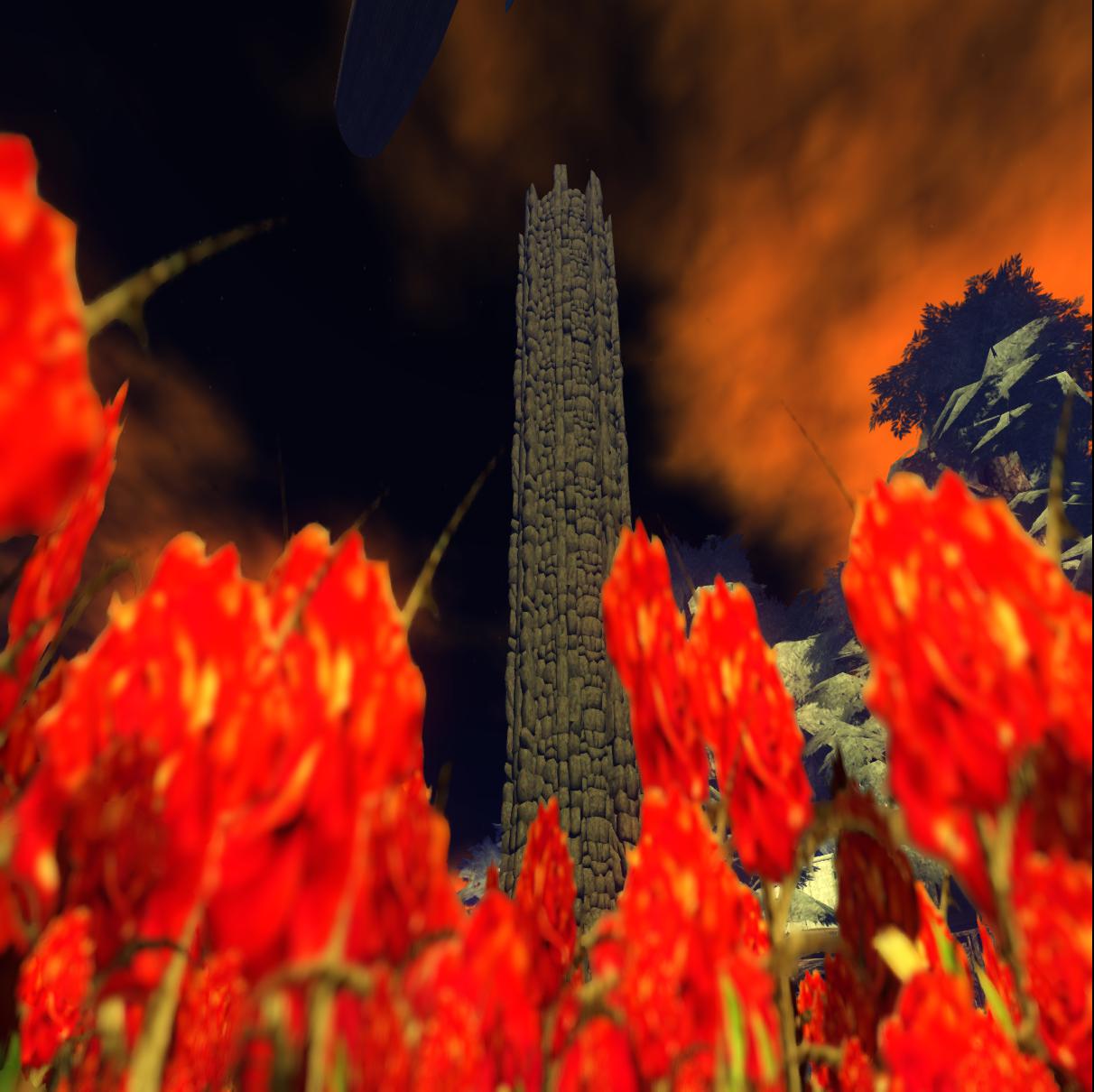 Crimson Fields, “The field of Oblivion” is built as a homage to Stephen King’s “Dark Tower” series. On entry the skies shift to a flat low light, a vast sea of red sways before you, fringed by brown rock walls and crumbling ruins. But the eye is drawn skywards, as you resolve upon the monstrous central feature of the sim an ominous, dark, gothic tower. Standing at the edge of the walls the sea of red becomes clear, no sea at all but a vast open field of overgrown thorns and scarlet red roses.