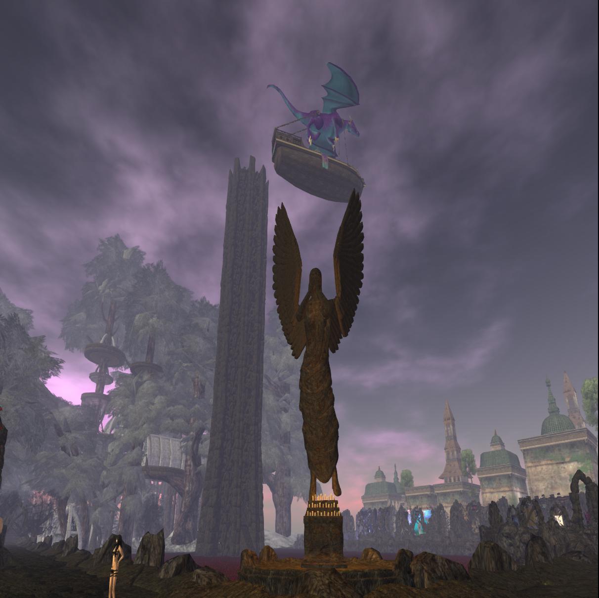 We look back with fondness to the calm security of Magnificat, but we must go on, many delights await us beyond this trial. What can one do when faced with such disturbingly dark scenes? Shop, of course! Each of the ruined, crumbling buildings that line the parapet walls is a store containing the wares of one of the wonderful Fantasy Faire merchants.
