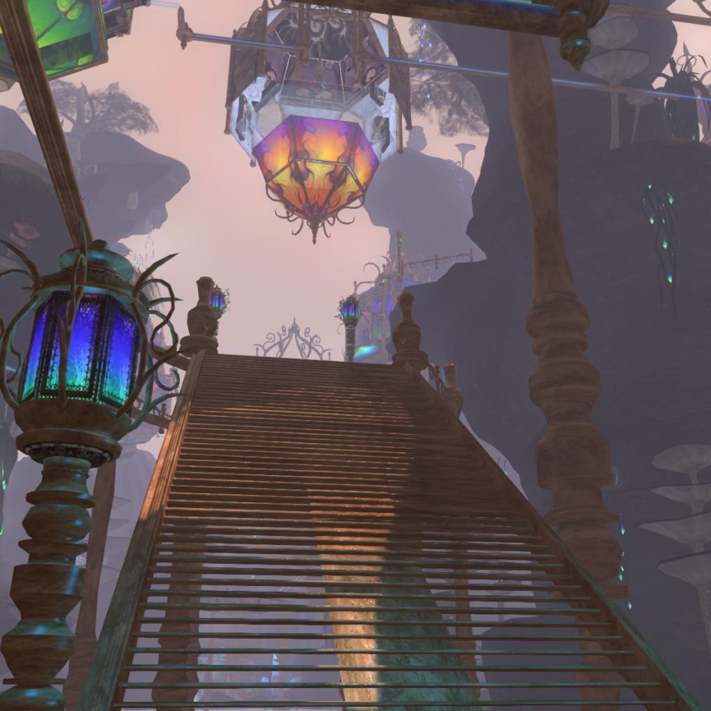 We enter from the forest floor to be greeted by a vast metallic stairway that rises to a platform out of sight. Beyond giant glass lanterns hang suspended on gigantic chains that are anchored into mysterious flooating rocks. A soft warmth of pink unearthly light permeates through the light mist. We ascend the steps…