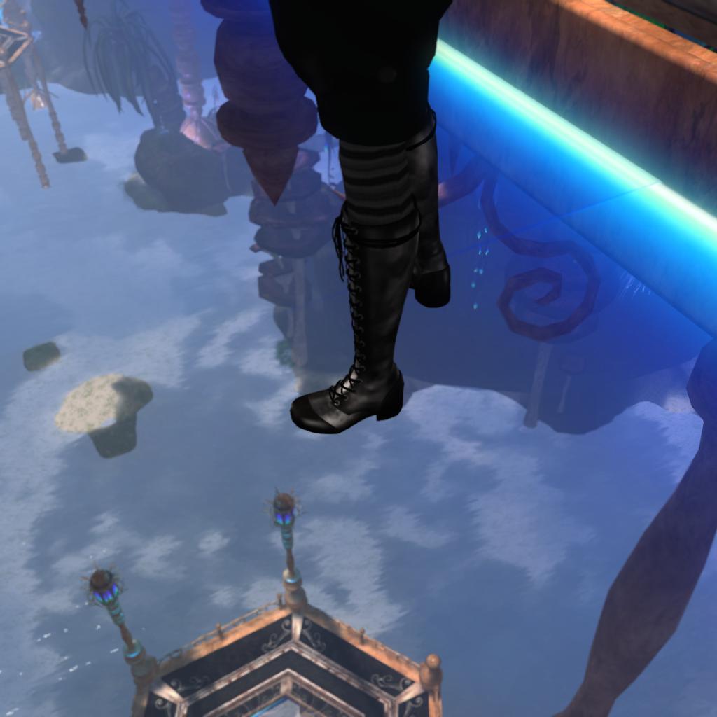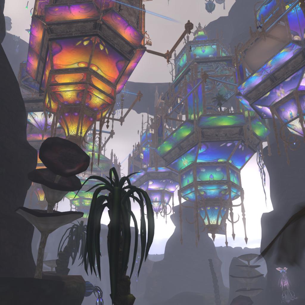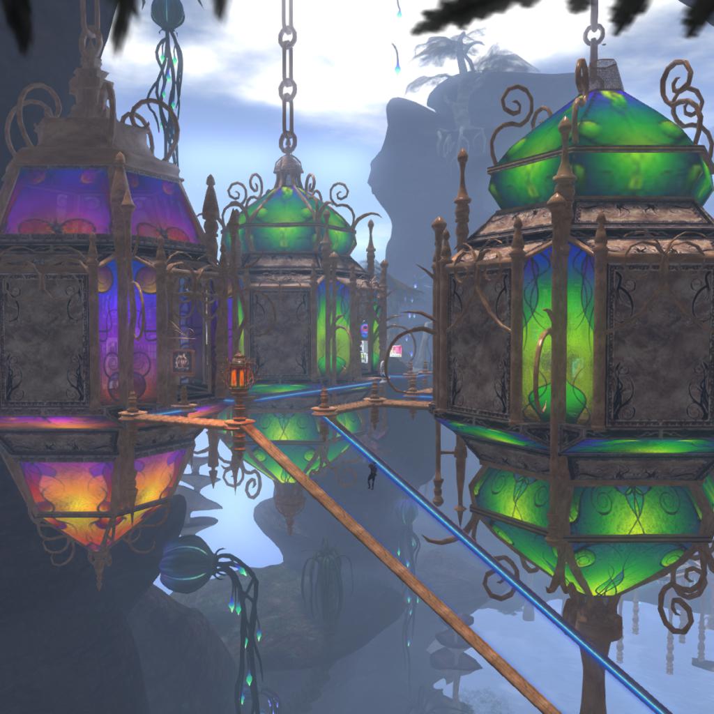 Below us lise a colourful swamp, dominated by alien plant life that is not entirely safe to be near, as Elicio himself discovered when they attempted to devour him during a Jail and Bail session. Each floating lantern, evoking thoughts of middle eastern charm and Art Nouveau elegance, houses a store or feature but getting to them requires an act of faith. In a peculiar parallel to the preceding Faireland region we find ourselves epxloring a multi-tiered land, yet the safety and solidity embodied by the sturdy wooden platforms and short vistas that rarely saw you looking down to the ground could not be further from experience in Titans Hollow.