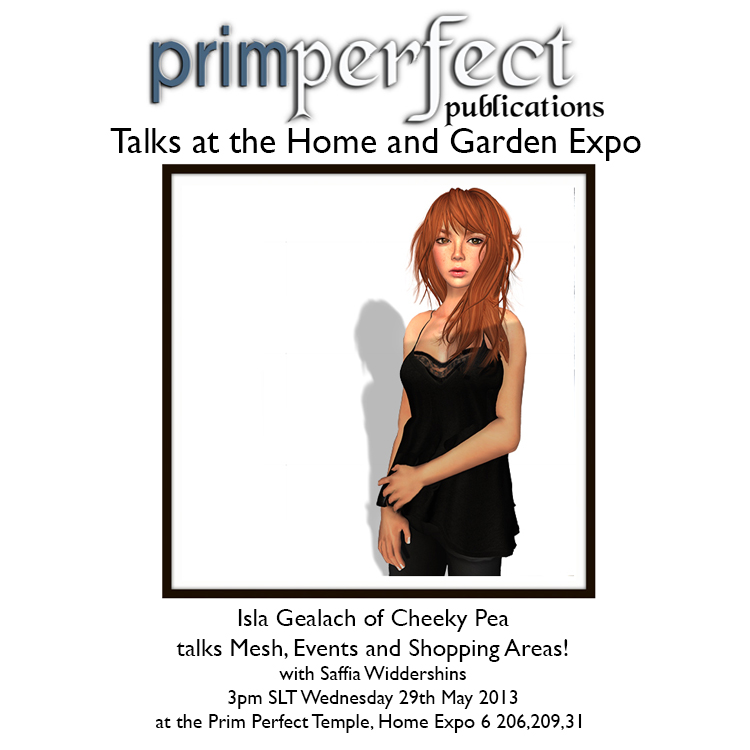 Today, Wednesday 29th May, we have Isla Gealach of Cheeky Pea, who will be talking about Mesh, Events (and maybe Mesh Events too!) and shopping areas. Isla, of course, is the owner of The Nest as well as Cheeky Pea, and has been running some very interesting projects there. We hope to learn about them at 3pm – so do join us!