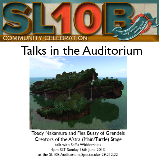 At 4pm, we will be talking to the people behind the A’stra Stage at this event (also known as the Main Stage and the Turtle Stage!) – Flea Bussy and Toady Nakamura, the janitors of the amazing Grendels. “As goes Grendels, so goes the grid,” Philip Rosedale (aka Philip Linden) famously remarked. Come along at 4pm to find out why!