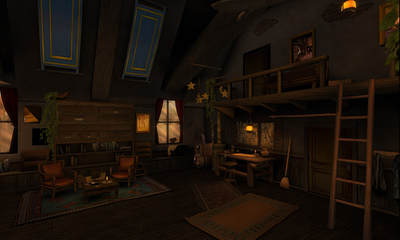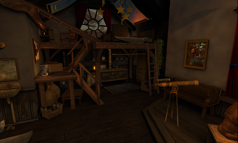 But there are other forces at work here too. In a couple of places you’ll find pressure boilers – and there’s a very workman-like work bench. Could it be that our artistshave a practical bent? And a taste for steampunk? Certainly that artist’s lay model looks a little … rusty. And there’s a telescope too – is that used for spying on the cigarette girls leaving the factory (yes, I am mixing my operas) or is it used for stargazing? And … is that an airship to be glimpsed through the upper window?