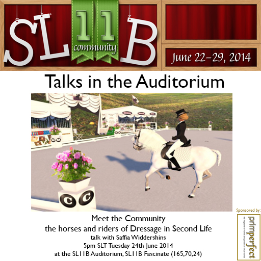 And finally, at 6pm, Saffia will be talking to a rather special community in Second Life – the horses and riders of Dressage in Second Life. They’ll be discussing the skills involved for horses and riders, how they function as a community and some of the events they have taken part in … and they will also be performing a quadrille with four horses – something that has never been done before in Second Life.