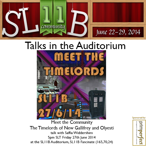 And finally, at 5pmSLT on Stage 1, we will be having a talk that is becoming something of a tradition here, as Saffia will be talking to the Dr Who roleplay community about life as Timelords!