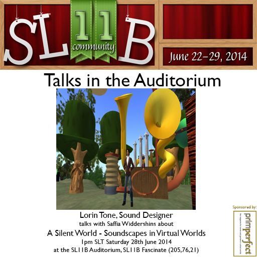 Next, at 2pm SLT on Stage 2, there will be a slightly different type of design to discuss. Lorin Tone, sound designer extraordinaire, will be talking to Saffia about his work and Second Life sound – and it’s entitled “A Silent World: Rant, Lecture and Discussion”.