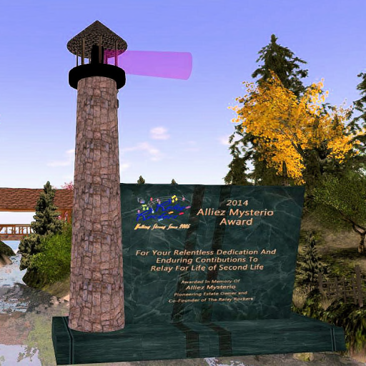 “To honor our friend and co-founder The Relay Rockers have established the Alliez Mysterio award. The award recognizes those people who have, like Alliez, made a lasting contribution to the world’s biggest virtual event, The Relay For Life of Second Life.”