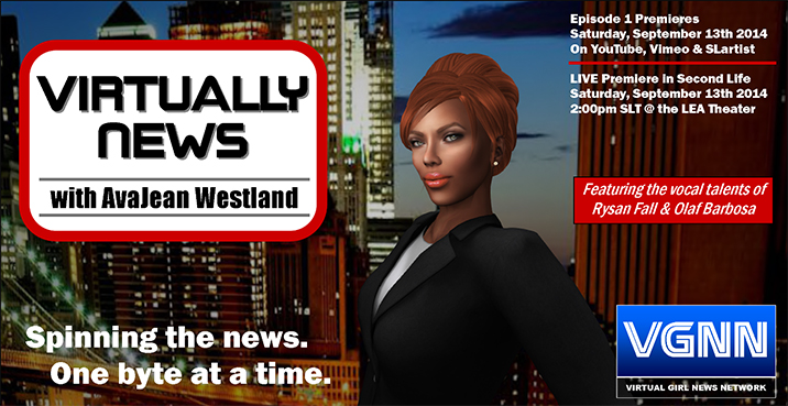 You are cordially invited to the premiere of the comedy machinima “Virtually News with AvaJean Westland” this Saturday, September 13th 2014 at 2:00pm SLT at the Linden Endowment for the Arts (LEA) sim. Creator AvaJean Westland will be on hand with actors and crew (scheduling permitted) from the film to talk about the making of the piece and to answer questions.