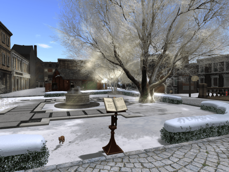 To experience another new aspect of this Edition of the Project, just by turn on “sounds” in your Second Life Viewer. A soundscape created by Dagmar Kohime will enhance the immersion of the region-exploring experience. Sounds of all kinds can be heard all over the region: a fiddler plays at Fezziwig’s warehouse, the sounds of Nephew Fred’s party guests wafts into the street near his home, and the Merchants Alley rings with sound of urchin laughter. The soundscape includes a special “Voices of the Story Path” hud that visitors can wear to hear short selections from “A Christmas Carol” in locations which corresponds to that selection from the story.