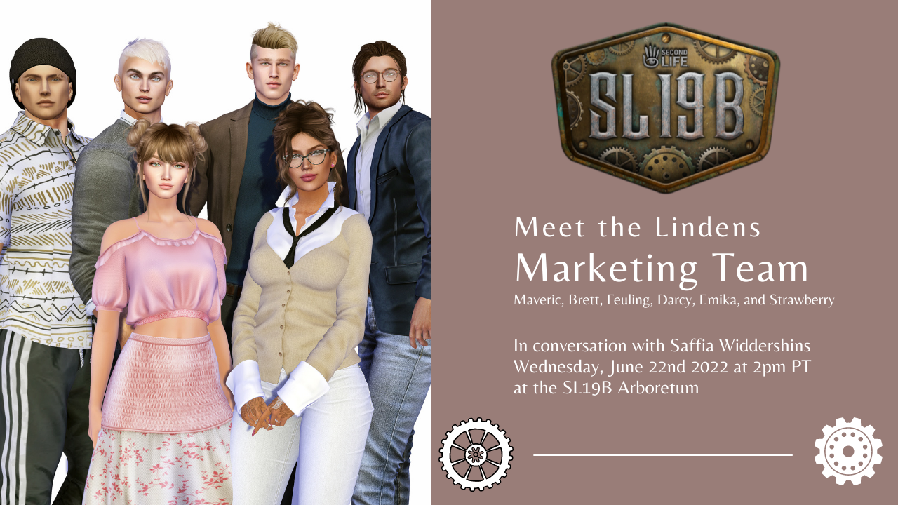 On Wednesday, in a second pre-recorded interview, we meet the Marketing Team, cosisting of Second Life Marketing Team, consisting of Feuling Linden, Chief Marketing Officer, Brett Linden, Vice President of Marketing, Darcy Linden, Director of Marketing, Strawberry, Senior Social Media Manager, Maveric Linden, Senior Marketing Analyst, and Emika Linden, Senior Marketing Manager.