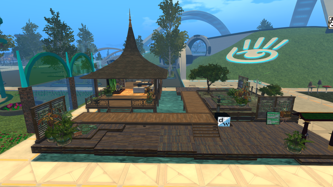 You can also visit the Designing Worlds installation, created by Aisling Sinclair, at http://maps.secondlife.com/secondlife/SLB%20Fabulous/111/208/23. Ash has created a beautiful relaxing area where you can sit and watch some of our shows from the past – and also pick up some Designing Worlds postcards – some reminders of the places we have visited over the years.